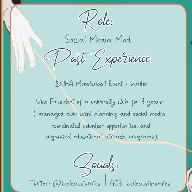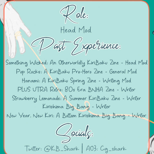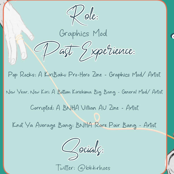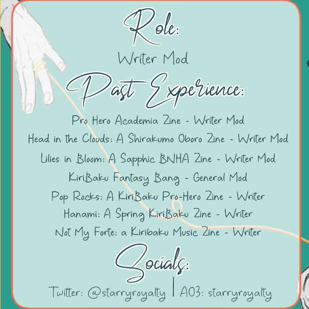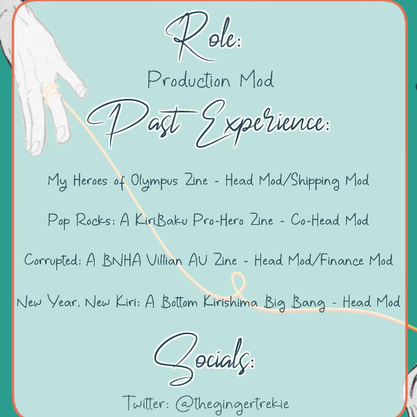 All of our mods have a varying degree of zine and bang experience. All relevant experience for our mod team can be found under the “Mods” tab on our Carrd. Our social media mod, Belle, is the only mod without zine-specific experience, but has relevant real-world experience and is very enthusiastic about the project.